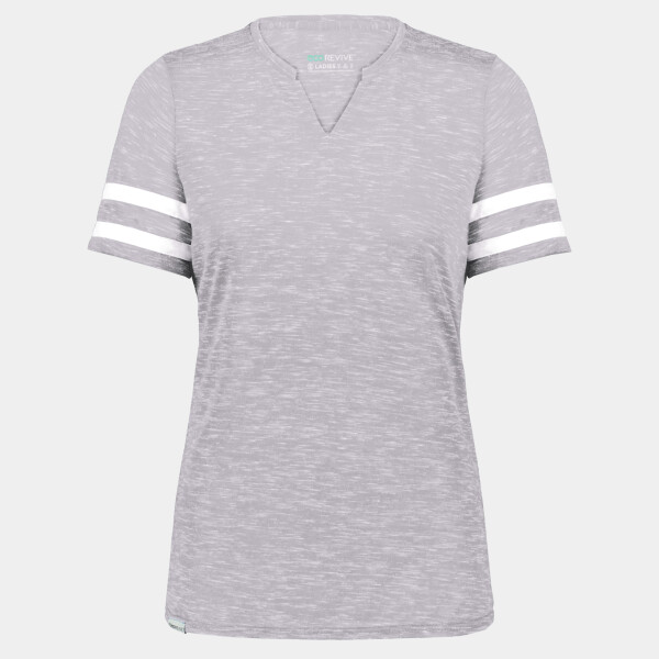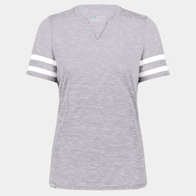 * Eco-Revive(r) product featuring 95% recycled polyester/5% cotton * Wicks moisture * Ladies' fit * Tag-free label * V-neck collar * Set-in sleeves